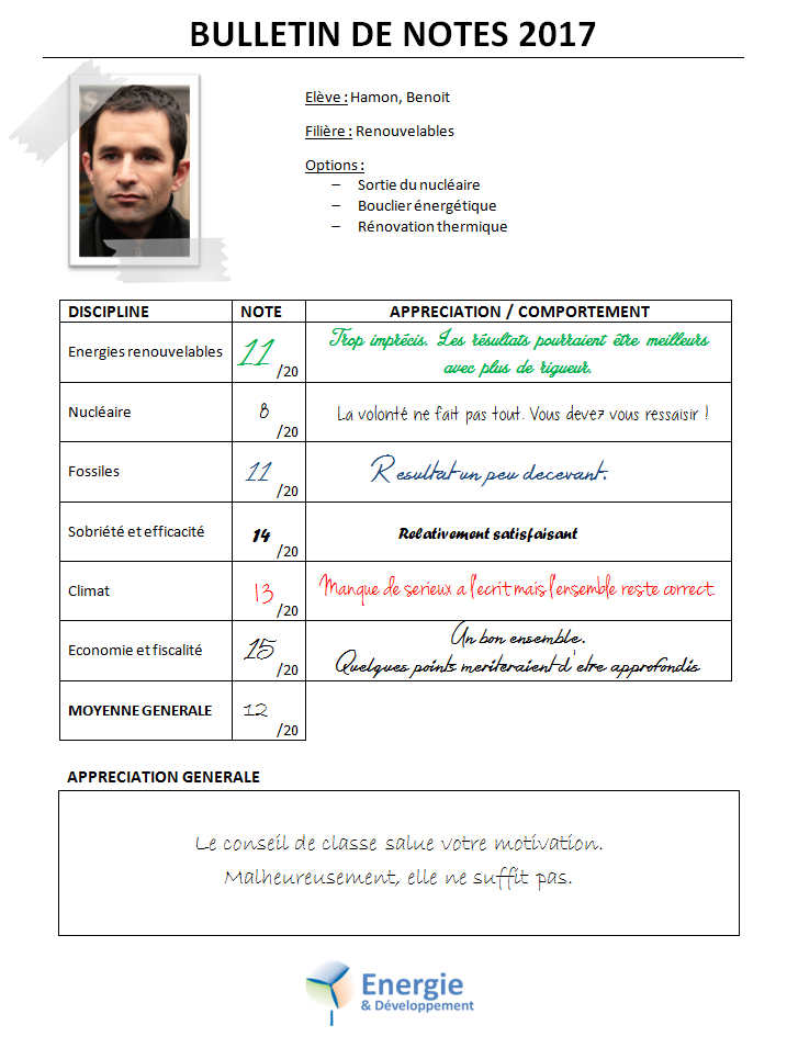 - Benoit Hamon veut baisser la part du nucléaire à 50% du mix électrique français en 2025 et en sortir totalement en 25 ans. Cela implique une fermeture rapide des centrales nucléaires françaises qui permettrait d'éviter de nouveaux investissements dans le parc existant. En revanche, il n'explique pas par quoi il compte remplacer la production nucléaire, cela fait peser un sérieux doute sur la crédibilité de cet engagement.
